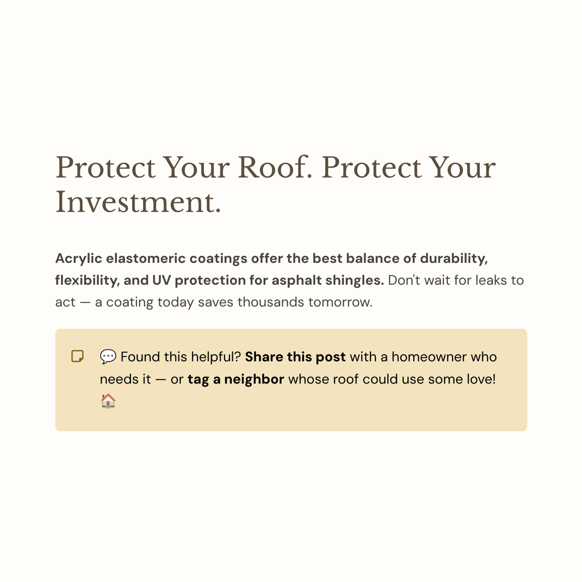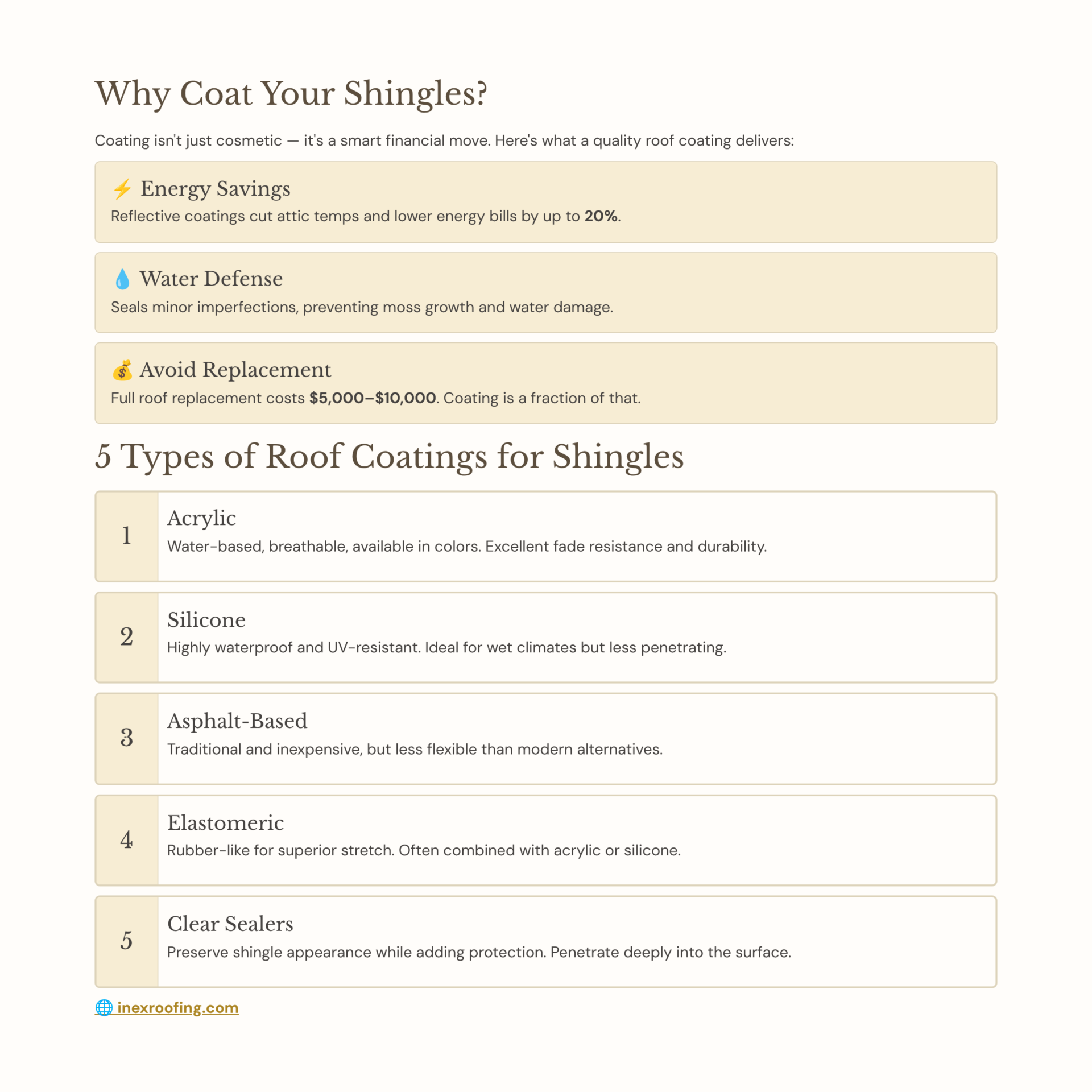 In conclusion, acrylic elastomeric coatings offer the best balance for shingle protection. Reach out to Inex Roofing for expert application.