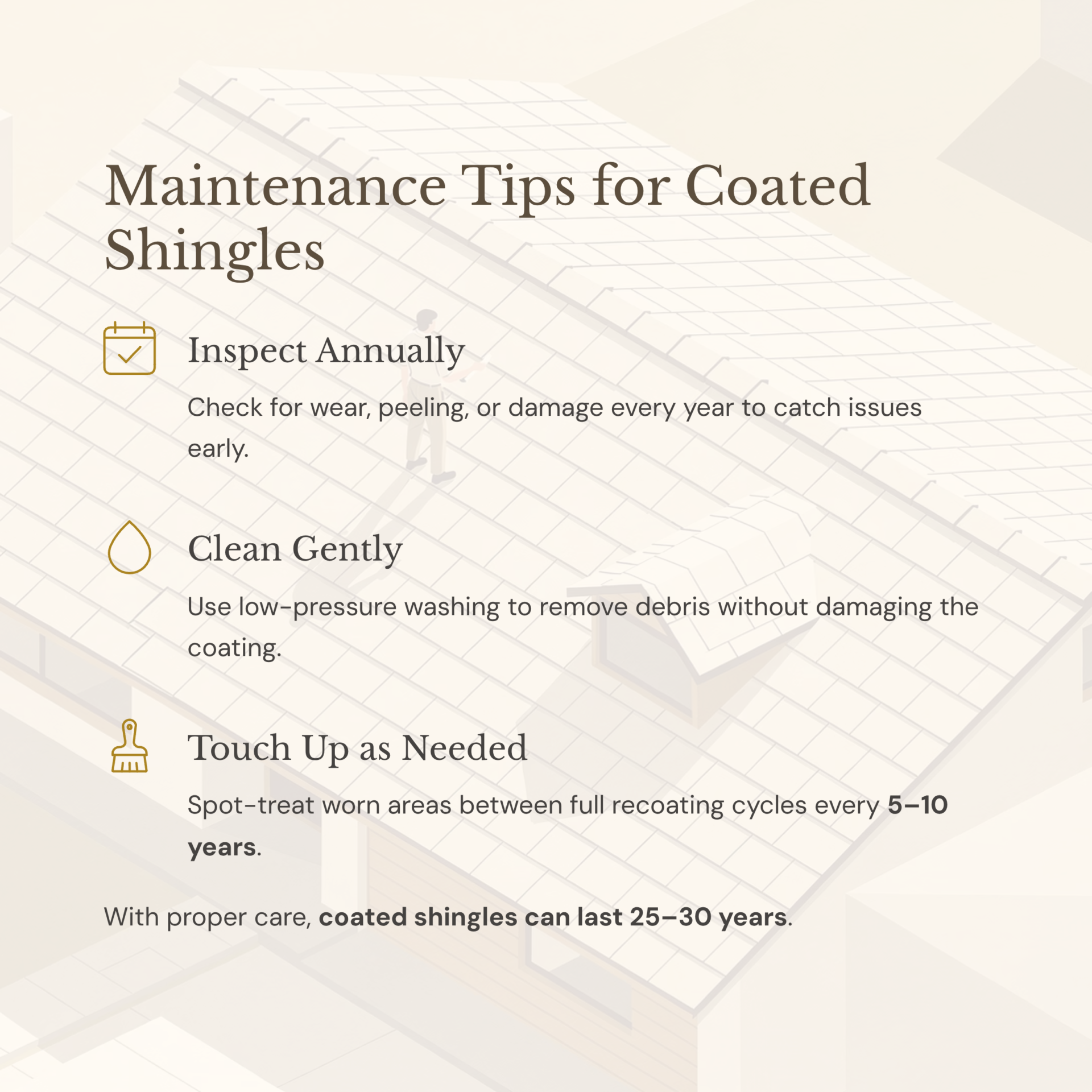 Inspect annually, clean gently, and touch up as needed. Coated shingles can last 25-30 years with care.